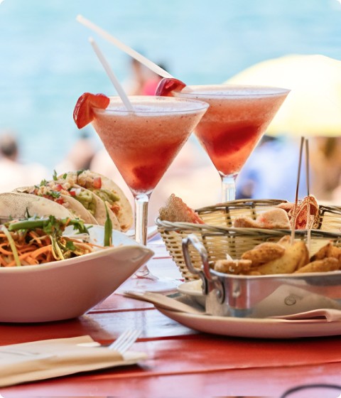 Tuck into our delicious lunchtime offerings, available poolside, at the Beach Bar, or through room service.